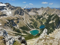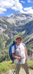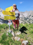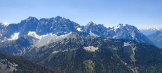 Die neuen Wirtsleute starten gerade in ihre 2. Saison und sind außergewöhnlich freundlich und das Personal sehr aufmerksam. Die Kuchen, drei an der Zahl, werden jeden Tag selbstgebacken. Abendessen gab es als 3-Gang Menue mit Frühstück für 44 €. Gott sei Dank hatten wir nur die selbstgemachten Würstel mit Sauerkraut und Kartoffelsalat oder Spinatknödel mit Salat. Dieses waren so reichliche Portionen, dass wir alle mehr als satt waren. Am nächsten Morgen gab es dann ein reichhaltiges Frühstücksbuffet mit selbstgebackenem Brot für 16 €. Der Kaffee kam übrigens aus der French Press. Da der Direktanstieg zur Soiernspitze wegen eines Schneefeldes lt. Hüttenwirt nicht möglich war, wäre uns nur die Möglichkeit mit Umrundung geblieben, d.h. nochmals 500 hm mehr. Die Überschreitung habe ich mir gestern wegen meiner derzeitigen Sehbehinderung nicht zugetraut. Somit haben wir uns getrennt, die beiden Berggemsen, Anke und Ivana, zogen los zur Schöttelkarspitze und umrundeten den Kessel mit der Soiernspitze. Wir gingen zur Gumpenkarspitze über die Jägersruh, die wir nach ca. 2 Stunden erreichten. Die Aussicht von hier ist einfach grandios, von München über das Wettersteingebirge ins Karwendel.