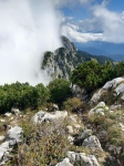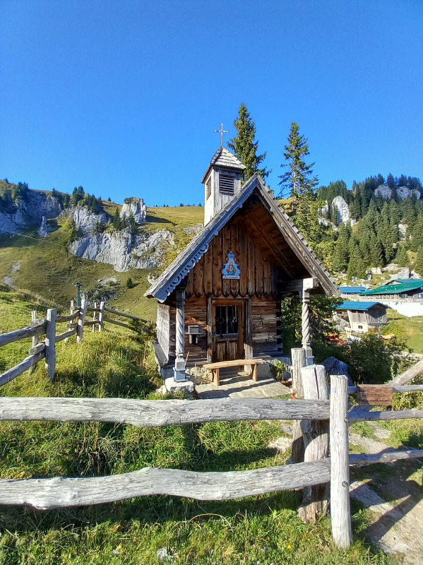 Die Hüttenwirte nennen alle Gäste beim Vornamen und haben sich diesen auch gemerkt. Es waren viele Familien mit Kindern unter den Gästen. Abendessen gab es um 19 Uhr, auch a la carte. Es konnten verschiedene Frühstücksarten ausgewählt werden. Am Morgen starteten wir über die Westroute des Aufstiegs zur Benediktenwand. Kurz nach den ersten Höhenmetern entdecken wir den ersten Steinbock. Vor der Glaswandscharte wanderte ein weiterer Steinbock, ca. 50 Meter vor uns auf dem Weg. Immer wieder blieb er stehen, drehte sich um, ob wir ihm auch folgen. Irgendwann ging er einen Schritt zur Seite um mit einem weiteren Böckchen zu äsen. Einige entgegenkommende Wanderer sichteten weitere direkt unter dem Gipfel. 1971 wurden 2 Böcke und 2 Geissen aus der Schweiz eingeflogen und ausgesetzt.  Mittlerweile gibt es bis zu 80 von diesen Bergbewohnern hier.  Auf der Westseite führt der Gipfelanstieg durch Latschenfelder. Bis wir dann endlich das neue Gipfelkreuz https://www.alpenverein.de/artikel/gemeinschaftsarbeit-gipfelkreuz-benediktenwand  entdeckten waren fast 2 Stunden vergangen. Teilweise hatten wir heute etwas Sonnenschein und kurze Nebellücken. Geplant hatten wir üer den alte Weiber Stieg nach Petern und in die Jachenau abzusteigen, allerdings fährt am Wochenende der Bus nur 2x am Tag, einmal um 10 Uhr und das weitere Mal um 16 Uhr. Runtergestiegen sind wir dann über die Ostseite mit einigen Drahtseilversicherungen zum Rotöhrlsattel. Weiter gings dieses Mal unterhalb der Achselköpfe hinunter zur Abzweigung ins Längental. Durch den immer stärkeren Nebel hatten wir Bedenken über die Längentalalmen abzusteigen, da es bereits um 15 Uhr zu dämmern begann. Den Aufstieg zum Probstalmsattel haben wir allerdings dann zeitlich auch unterschätzt. Oben erwartete uns Sonnenschein. Weiter ging es den Idealhang runter zur Stie-Alm. Von hier stiegen wir wieder zur Brauneckbahn nach oben und erreichten kurz vor 17 Uhr noch eine der letzten Gondeln.