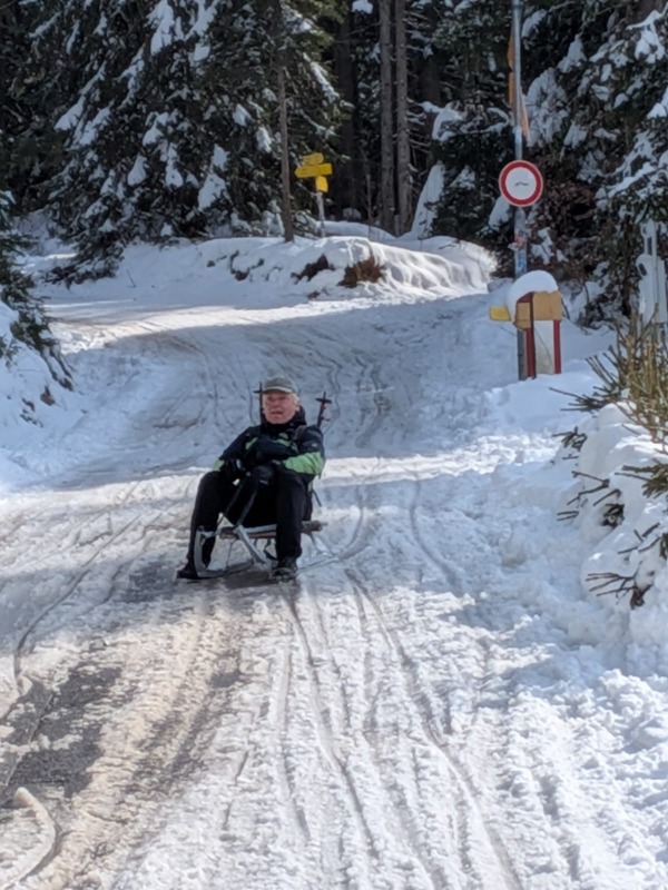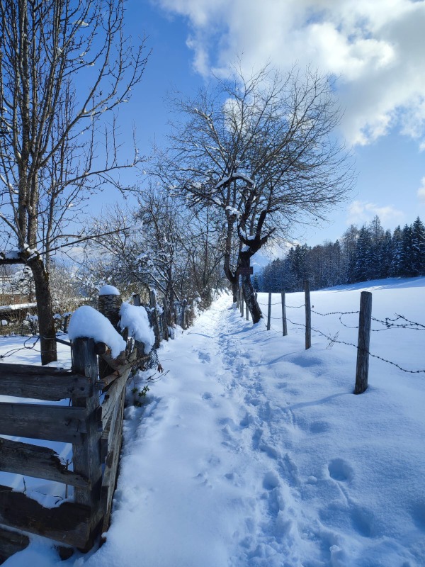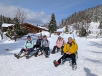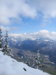 Die Forststraße war ziemlich rutschig und wir schlupften in unsere Grödel. Nach ca 30 Minuten konnten wir die gut benutzte Forststraße nach links verlassen und schlugen den Pfad Richtung Pendling ein, Es war sehr vorteilhaft, daß bereits einige vor uns den Weg gespurt hatten. In gleichmäßiger Steigung zieht sich der Weg in langen Serpentinen durch den Wald. Als sich der Wald nach ca 1,5 Stunden lichtet gehen wir geradeaus weiter direkt auf den Pendlinggipfel zu. Winterliche Ausblicke tun sich auf, der wilde Kaiser, ins Inntal, nach Kufstein hinunter - alles frisch beschneit. Da die Sitzmöglichkeiten sehr begrenzt waren zogen wir weiter Richtung Pendlinghaus. Dieses eröffnet jedoch erst wieder am Ostersonntag. Weiter ging es auf der schneebedeckten Forststraße am Grat entlang Richtung Heimkehrerkreuz und dann in Kehren hinunter zur bärigen Kala-Alm. Die Speisekarte war sehr abwechslungsreich und meine Spinatknödel in Gorgonzolasauce waren jedenfalls richtig guad. Die Sonnenstrahlen geniesend konnten wir uns an der Hüttenwand anlehnen. Nach einem Schnapserl waren wir dann mutig genug die Abfahrt mit den Rodeln zu starten. Und was soll ich sagen, es war eine Riesengaudi.