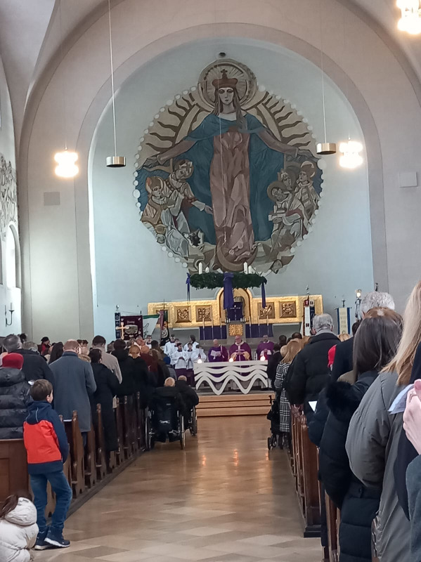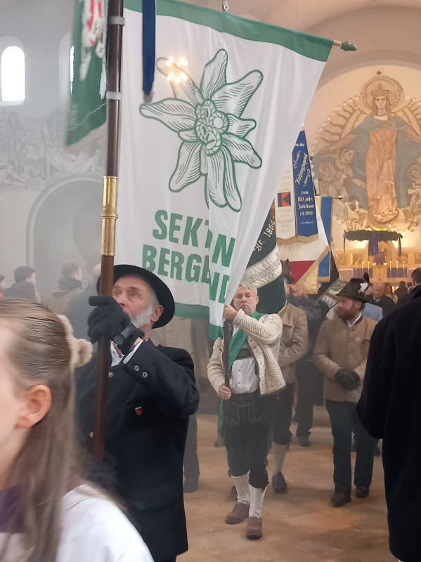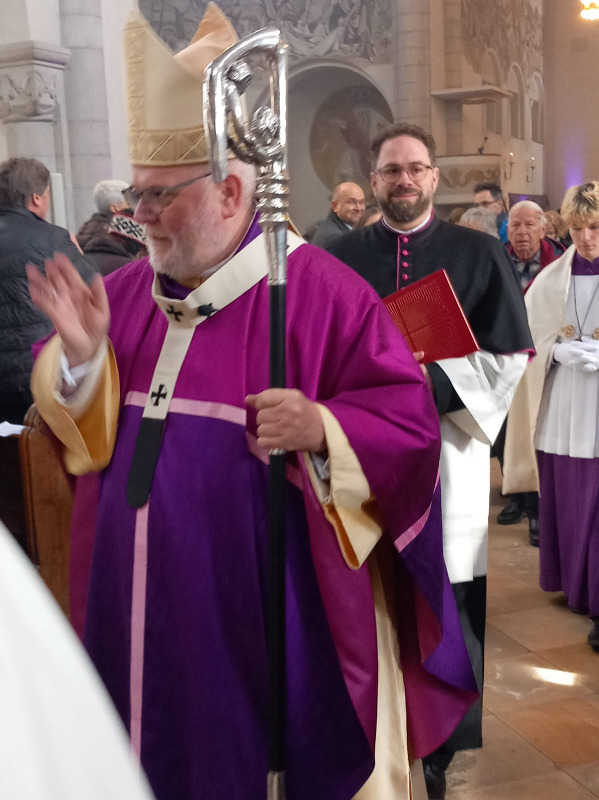 Der Einzug erfolgte mit 7 Fahnenabordnungen in die restlos ausgefüllte Kirche. Der Chor stimmte erst ein Stück von G. da Palestrina an, während Kardinal Marx die Gläubigen mit geweihtem Wasser besprengte. Nachdem der Erzbischof mit seiner sonoren Stimme die Predigt über den neuen Altar, als Tisch an dem Alle einen Platz finden, hielt,stimmte der Chor weitere Stücke von Bruckner und Brahms an. Die Altarkerzen wurden entzündet und der Adventskranz gesegnet. Während der Kommunion wurde das Agnus Dei aus der Messe von G.B. Casali gesungen. Nach 2 Stunden war die Messe beendet und man traf sich noch auf dem kleinen Christkindlmarkt vor der Kirche