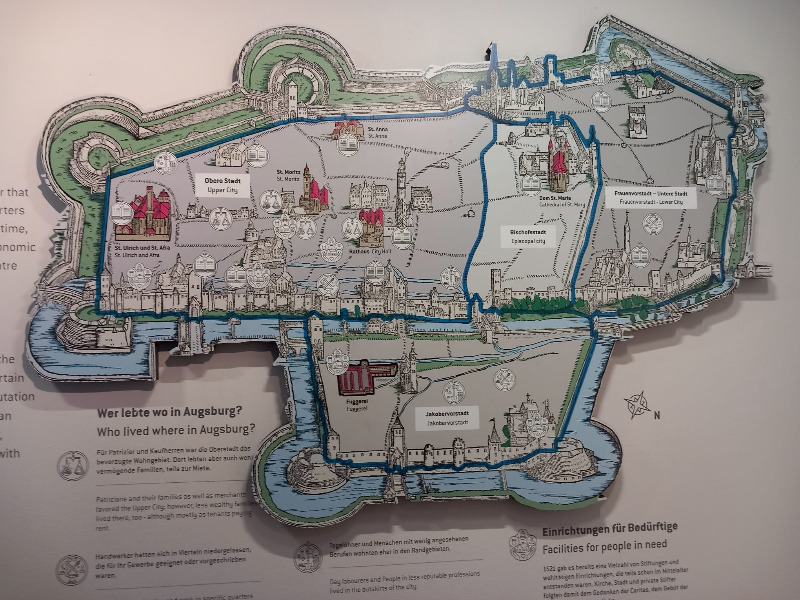 Unser heutiger Stadtspaziergang führte uns ins Schwäbische, nach Augsburg. Dazu trafen wir uns diesmal schon um 9 Uhr 45 in Pasing, um mit dem nächsten Regionalzug zum Augsburger Hauptbahnhof weiterzufahren. Nach ungefähr 30 Minuten erreichten wir diesen schon. Da wir noch viel Zeit bis zum Mittagessen hatten, entschlossen wir uns erst zur Fuggerei und dem dazugehörigen Museum zu gehen. Diese erste Sozialsiedlung der Welt, die Jakob Fugger, der damals reichste Mann Deutschlands mit einem Vermögen von umgerechnet 400 Mrd. Euro, schon 1521 für bedürftige Mitbürger errichtet hat, ist heute noch bewohnt. Die Fuggerei besteht aus 140 Wohnungen in 67 Häusen und alle entsprechen heutigem Wohnstandard.