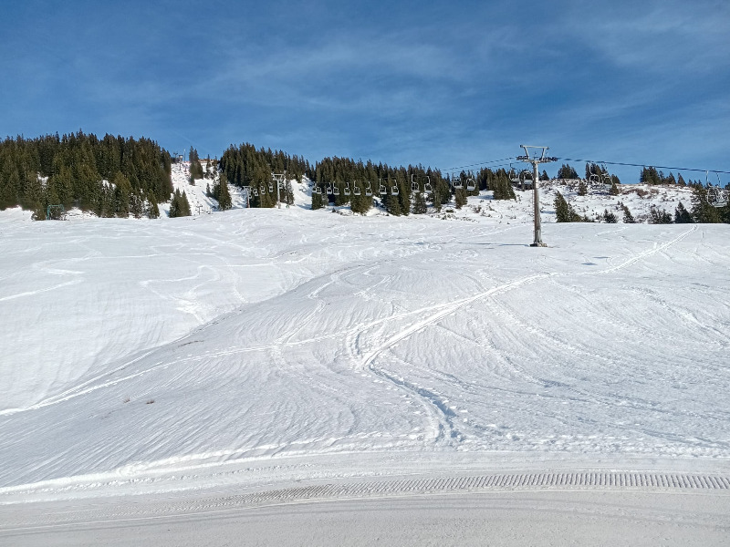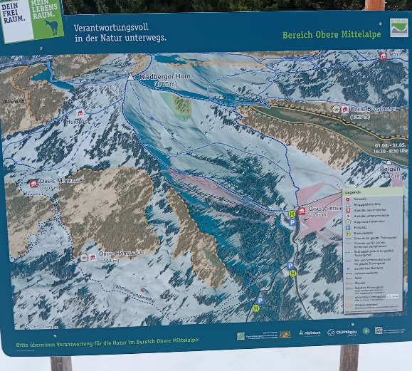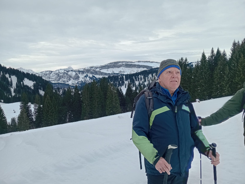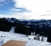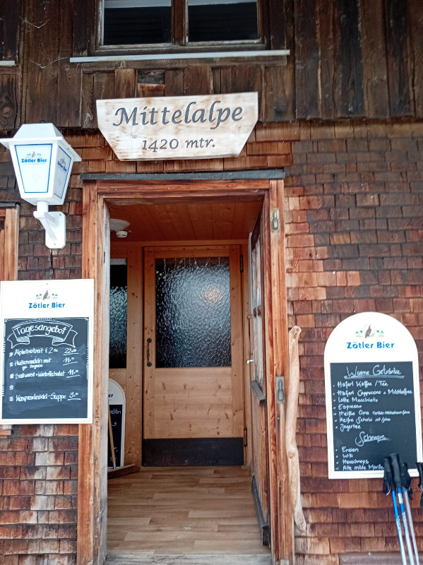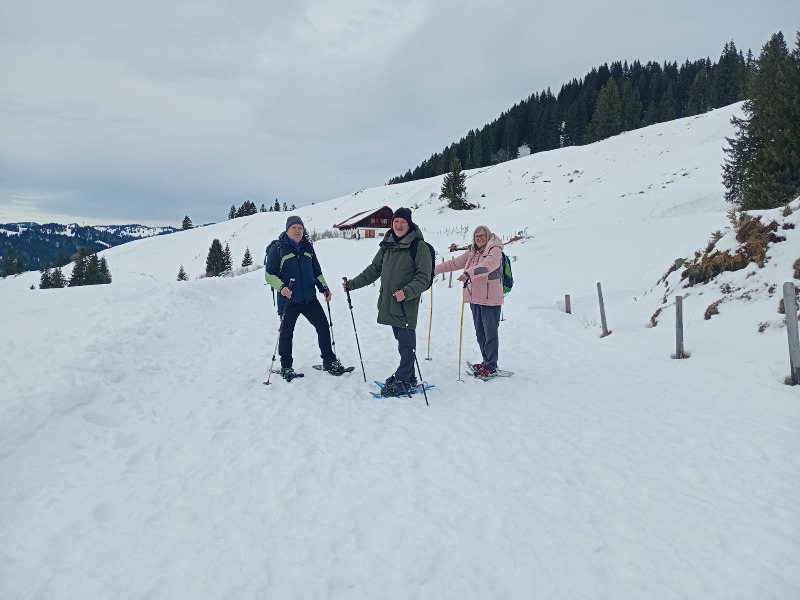 Heute Morgen trafen sich alle bei mir um die Autos abzustellen und mit einem weiterzufahren. Das Navi hatte eine Fahrzeit von knapp 2 Stunden zum Riedbergpass angezeigt und so konnten wir das Auto bereits um kurz nach 10 Uhr, auf dem relativ leeren Parkplatz, parken. Das Ausleihen der Schneeschuhe funktionierte ebenfalls problemlos, 13 € täglich. Für uns Anfänger war der ausgesuchte Hang jedoch zu steil, so daß wir uns entschieden wieder abzusteigen und Richtung untere Alpe aufbrachen. Die untere Alpe hatte geschlossen und wir stapften weiter zur Mittelalpe. Diese lag traumhaft und dort lugte sogar die Sonne hinter den Wolken hervor, so daß wir beschlossen uns draußen hinzusetzen. Die üblichen Gerichte standen auf der Tageskarte, Würstel, Käsenudeln oder Kaspressknödelsuppe. Es gab selbstgemachten Schinken und Käse, da die Wirtsleute diese Alm nur im Winter betreiben.