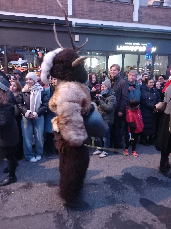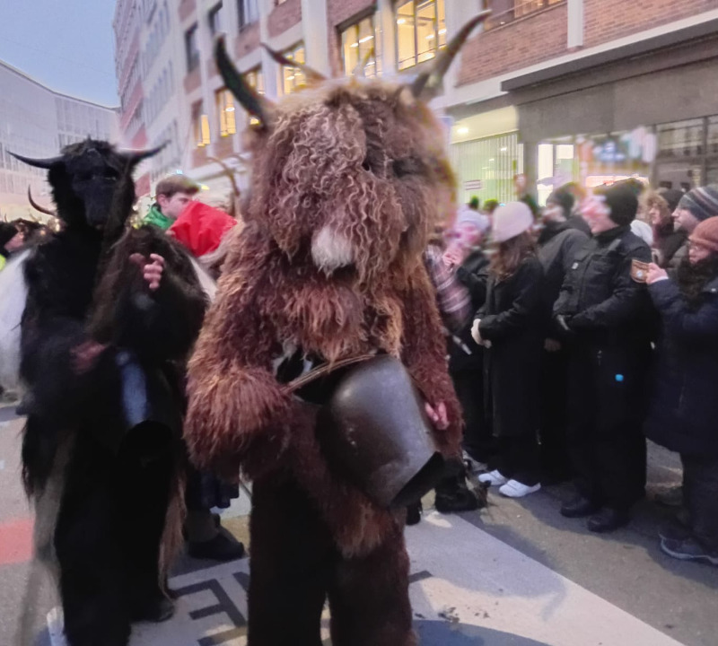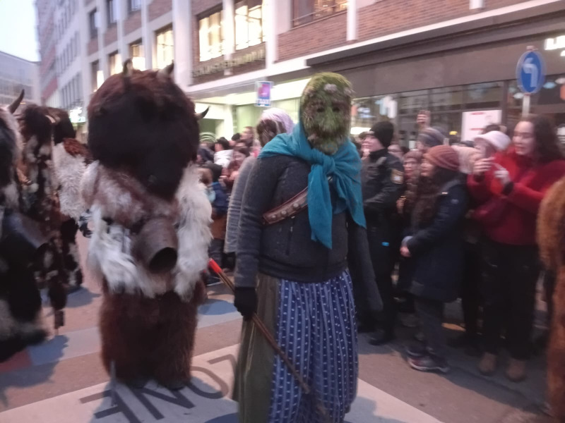Gestern waren wieder die Perchten in München. Von der Polizei und Ordnungskräften warenwieder die Straßen abgesperrt worden, doch trotzdem verschmälerten neugierige Zuschauer die Straßen immer wieder, um möglichst viel zu sehen. Die Zuschauer standen machmal in bis zu acht Reihen hintereinander. Es herrschte vor dem Perchtenlauf und am Anfang ein sehr großes Gedränge. Dieses löste sich bei weiteren Perchtengruppen immer weiter auf, so daß wir anfangs stehend in der achten Reihe im Verlauf der Zeit immer weiter nach vorne geschoben wurden. Es waren wieder viele schöne Perchtengruppen da, aus dem Voralpenland und aus Österreich. Schon von weitem konnte man die Perchten hören, mit ihren Kuhglocken und Schellen.