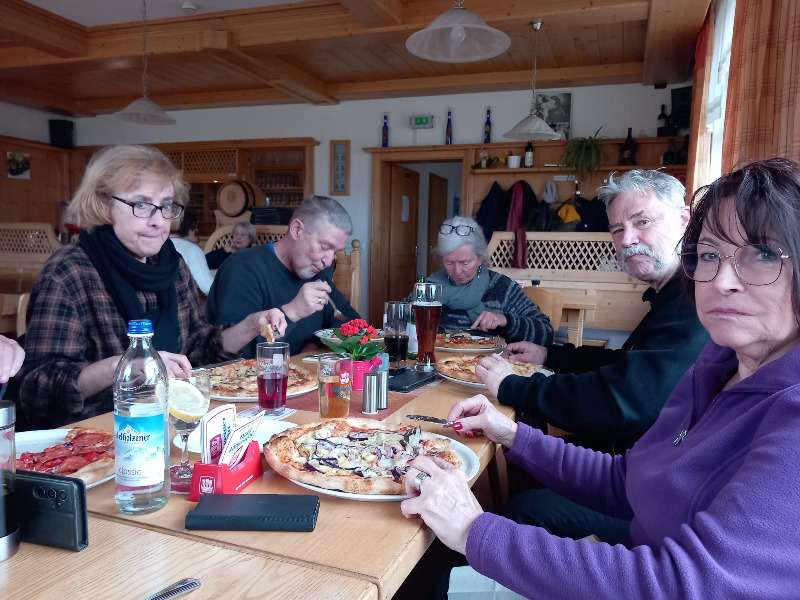 Das Restaurant erinnert durch die Speisekarte an "gute alte italienische" Küche, wie wir Sie von früher gewohnt waren.  Nach dem Espresso wurden die Storchennester von Kottgeisering bewundert.  1563 wurde die Valentinskapelle geweiht.  Vorbei am alten Rathaus ging es weiter ins Moos hinein. Leider begann dann auch der vorhergesagte  Regen. Durch das kleine Wäldchen blieben wir vorerst noch trocken. Wir überquerten die Hauptstraße und gingen durch Zankenhausen weiter über die Felder nach Türkenfeld hinein. Es wurde immer kälter und nässer und alle waren froh als wir dann den Bahnhof Türkenfeld erreichten. Die S-Bahn kam dann auch innerhalb von 10 Minuten und brachte uns wieder zurück zum Ausgangspunkt.