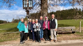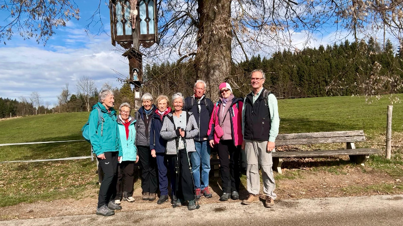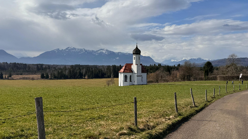 Zuerst ging die Wanderung auf den Höhenweg bei St. Johannisrain. Von dort konnten wir einen schönen Blick Richtung Benediktbeuern und die Berge im Süden genießen. Leider war die Kapelle St. Johann Baptist, ein wunderbares Fotomotiv, geschlossen.