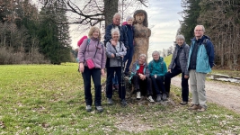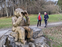 Nach 3 Stunden Wandern und mit entsprechendem Appetit erreichten wir in Richtung Sindelsdorf die Gaststätte Urthalerhof. Nach einer Mittagspause gingen wir weiter über Unterriedern, wieder auf dem Weg in Richtung St. Johannisrain, diesmal aus der anderen Richtung. Am Ende des Wegs entdeckten wir noch zwei Fotomotive, von Oliver Kogler aus Baumstümpfen herausgearbeitete Holzskulpturen.