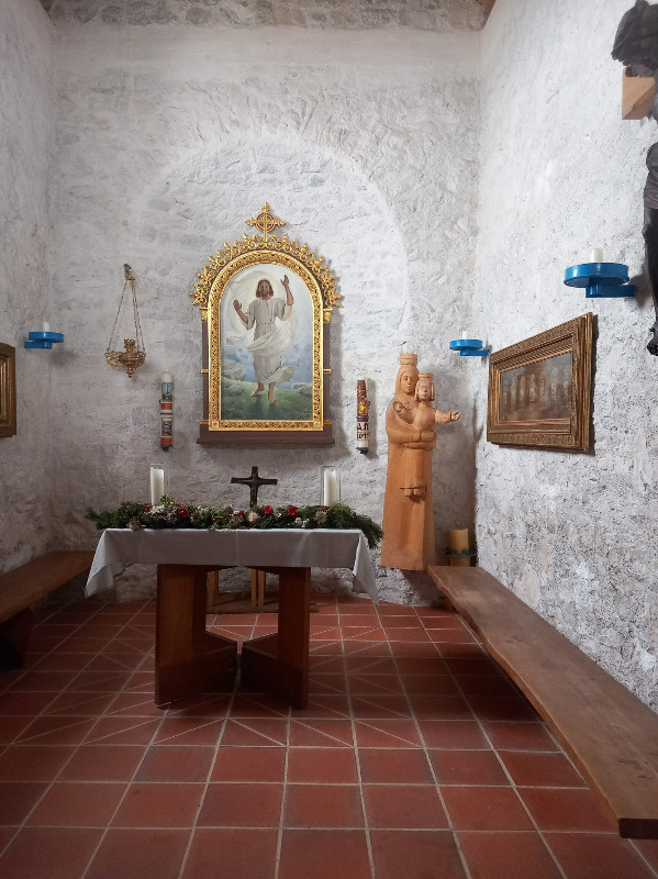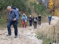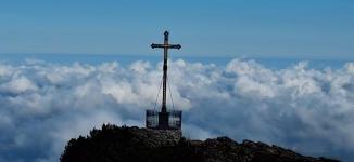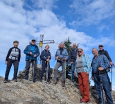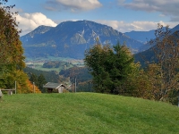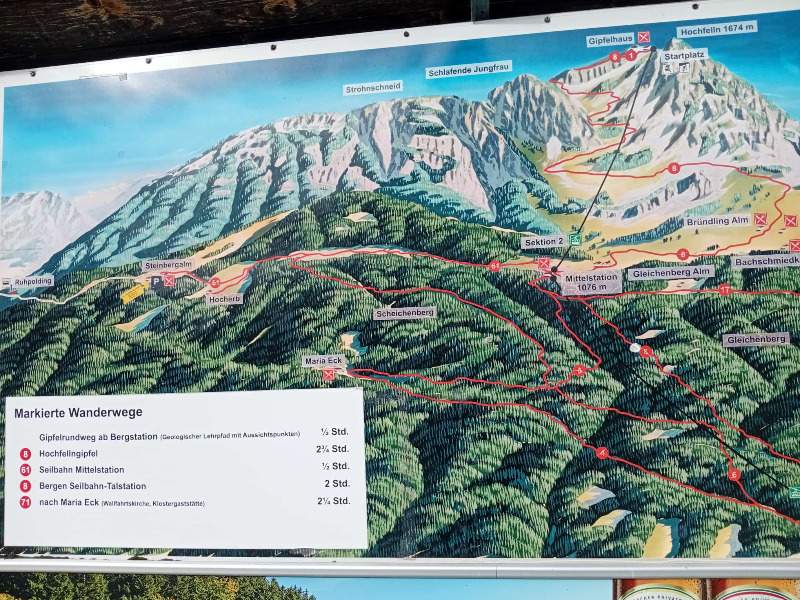 Wir zogen schnell unsere Bergstiefel an, nahmen unsere Rucksäcke und Stöcke und wanderten los Richtung Mittelstation der Hochfellnbahn. Beim Abzweiger zu dieser Mittelstation trennten sich zwei Mitwanderer von unserer Gruppe, um mit der Seilbahn zum Gipfel zu schweben. Wir übrigen acht gingen weiter hinauf Richtung Bründlingalm. Oberhalb der Bründlingalm konnten wir auch schon unseren ersten Gipfel mit Gipfelkreuz besteigen. Das Bründlingköpfl ist ein mit Gipfelkreuz geschmückter Aussichtspunkt auf 1221 m Höhe. Von hier aus stiegen wir weiter bergauf durch den herbstlich geschmückten Bergwald. Ab und zu sahen wir jetzt auch Wolkenlücken und die Sonne ließ sich blicken. Der Weg wurde jetzt immer steiler. Nicht nur durch die Sonne kam ich ins Schwitzen. Nach weiteren Höhenmetern und etlichen Serpentinen konnten wir auch schon die Gipfelstation der Hochfellnbahn und den Gasthof erkennen. Dort wurden wir auch von unseren zwei Mitwanderern erwartet. Nachdem wir Übrigen diese begrüßt hatten, beschlossen wir erst noch zur Taborkapelle und zum Gipfelkreuz zu gehen. Danach besuchten wir die Wirtschaft und stärkten uns mit Speis und Trank im Inneren, denn hier heroben wehte ein kalter Wind und es war wieder sehr neblig geworden. Es gab verschiedene Suppen oder auch Wiener und Kassler mit Kraut, oder den berühmten Kaiserschmarrn. Auch ein warmer Kaffee oder Tee durfte nicht fehlen. Später verzogen sich die Wolken und gaben einen kurzen Blick auf den Chiemsee mit seinen 3 Inseln, Herrenchiemsee, Fraueninsel und Krautinsel frei. Den Rückweg legten acht mit der Seilbahn zurück, während zwei noch nicht genug vom Bergsteigen hatten und auch den Abstieg zu Fuß zurücklegten. Es war ein schöner Ausflug in die Berge auch wenn der Nebel die Sicht stark einschränkte.