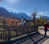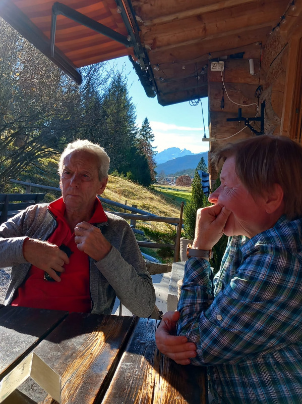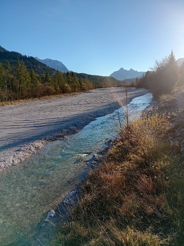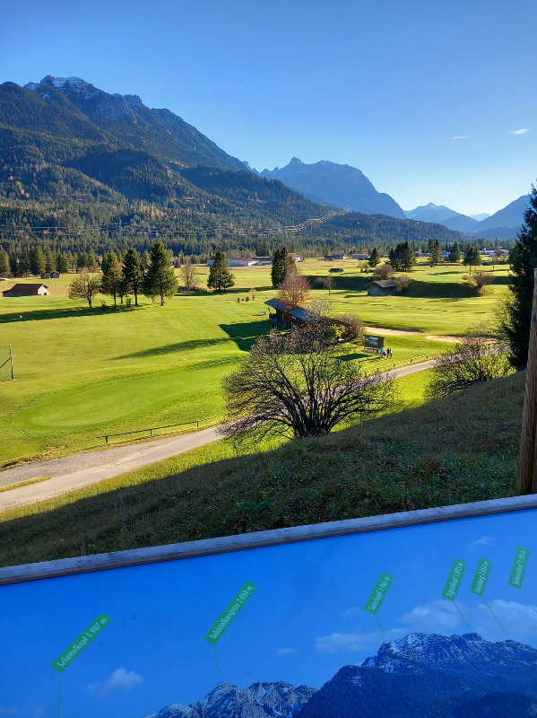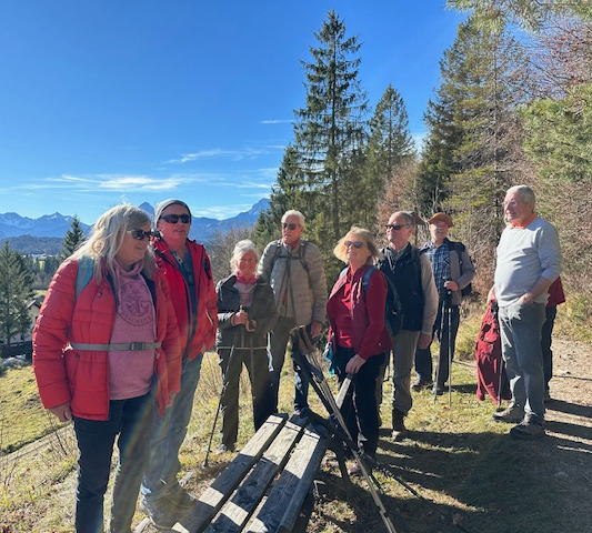 Am Donnerstag den 06.11. haben wir uns vor meiner Wohnung in Wallgau, getroffen. Gegen 10:30 sind wir zu Zehnt plus Hund bei bestem Wetter aufgebrochen. Zuerst besuchten wir kurz das alte Wallgau mit sehr schönen alten Häusern und kleine Scheunen, die zum Teil zu Ateliers und kleinen Werkstätten umgebaut sind. Danach folgten wir dem Magdalena-Neuner-Panoramaweg, ca. 100 Höhenmeter über Wallgau, in Richtung Norden. Ein kurzer Stop und ein Blick zurück lohnte sich, da das ganze obere Isartal vom Karwendel bis hin zu Ötztaler Alpen in der Ferne zu bewundern war.
