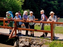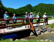 Wir wussten am Anfang noch nicht, dass ausgerechnet an diesem Samstag die Alm, die sonst am Wochenende geöffnet hat, kurzfristig geschlossen war. Wir hatten die Tour extra vom Donnerstag auf Samstag verlegt. Wir ließen uns das aber nicht vermiesen zumal am Alatsee mit dem Allgäuer Hof eine sehr gute Wirtschaft war, die uns nach einer Wanderung von ein und ein viertel Stunden zu einer Mittagspause einlud. Man muß halt flexibel und angesichts der Hitze war manche froh nicht den Anstieg zu Alm machen zu müssen. Der Rückweg führte um den Alatsse herum auf der anderen Seite wieder über Bad Faulenbach zurück nach Füssen. Durch die eingesparte Zeit konnten wir uns in Füssen noch die Einkehr in einem schönen Cafe leisten und trotzdem unseren Zug nach München um 16.20h erreichen. Insgesamt doch noch ein schöner Tag mit Tierbeobachtungen, wie einer Ringelnatter und einer Erdkröte und einer wunderschönen Landschaft. Die Saloberalm ist auch im Winter einen Ausflug wert.