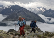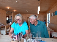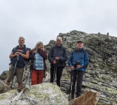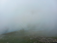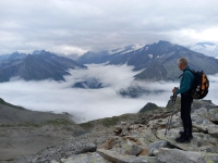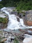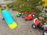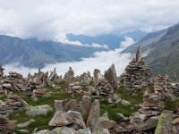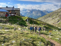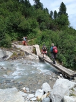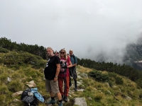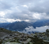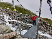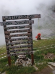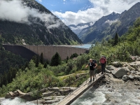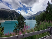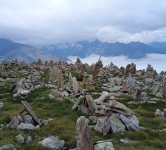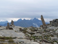 Der weitere Weg zog sich doch noch ganz schön hin, so daß wir erst nach mehr als 3 Stunden die höchstgelegene Hütte im Zillertal erreichten. Das auch als "jüdische Hütte" bekannte Friesenberghaus liegt auf 2500 Meter Höhe und wird seit diesem Jahr von einem neuen, jungen Pächterpaar bewirtschaftet. Die Küche erinnert eher an eine Disko. Wir hatten ein Zimmer mit 5 Betten gebucht. Als Halbpension für 49 € gab es Backerbsensuppe, Linseneintopf mit Semmelknödel und Buchteln mit Vanillesauce. Das einfache Frühstück kann auch für 18 € einzeln gebucht werden. Am nächsten Morgen hatte der Regen aufgehört und wir zogen Richtung hoher Riffler los. Leider bewölkte es sich im Verlauf des Aufstiegs immer mehr und bei den ersten Regentropfen drehten wir um, da uns der weitere Aufstieg auf den dann schmierigen und rutschigen Blocksteinen zu riskant erschien. Beim Abstieg stoppte der Regen und wir kletterten noch auf das Petersköpfl. (2679 m) hinauf. Wir wurden bereits vorgewarnt, daß wir uns ins Hobbitland begeben würden. Oben erwarteten uns unzählige Steinmännchen über deren Entstehungsgeschichte es verschiedene Theorien gibt. Über Steinplatten stiegen wir dann wieder zum Haus mit dem malerischen, türkisblauen Friesenbergsee hinunter. Auf den letzten Metern setzte dann der schon versprochene Regen wieder stärker ein, so daß wir am Nachmittag noch Zeit für Kaffee, Kuchen und Schafkopfen hatten. Abends wurde dann das Bergsteigeressen, ein Chilli sin carne, für 11 € serviert. Obwohl es am nächsten Morgen immer noch regnete, beschlossen wir trotzdem zur Olpererhütte abzusteigen. Zuerst mussten wir ziemlich steile Serpentinen nach oben auf die 2620 Meter hohe Scharte bevor wir die anspruchsvollen Querpassagen erreichten. Das Teilstück des Berliner Höhenwegs führte uns durch wildromantisches Gelände. Die vielen Wasserläufe die das Gebiet durchzogen, führten durch den Dauerregen Hochwasser und unsere Socken blieben leider nicht trocken. Endlich erreichten wir die berühmte, als spektakulär beschriebene Hängebrücke - diese führt jedoch nur in ca 2 Meter Höhe über den Rippenbach. Da es regnete gab es keine Warteschlange für das obligatorische Foto. Die neu erbaute Olpererhütte (2398m) wird nicht nur wegen der "weltberühmten" Brücke von vielen Touristen besucht. Es gibt für Kinder einen großen Fuhrpark, ein Barbiehaus und auch eine Matschküche. Der große Aufenthaltsraum kann durch Schiebetüren geteilt werden und ist mit großen Panoramafentstern ausgestattet. Leider war bei uns die versprochene Aussicht nicht vorhanden. Der Wetterbericht sagte keine Besserung voraus und daher beschlossen wir nach einem Mittagessen die Tour abzubrechen. Der Hüttenwirt kam uns mit der Stornogebühr für die gebuchte Übernachtung entgegen, so daß wir nur 10 € pro Person bezahlen mussten. Die Abstiegszeit war mit nur einer Stunde angegeben, aber wir Rücken-, Knie-, und Fußkranken benötigten ca 2,5 Stunden. Es waren unzählige, unterschiedlich hohe, Felsentreppen und Serpentinen zu bewältigen bevor wir dann gegen 15:30 Uhr am Schlehgeisspeicher unseren Bus besteigen konnten. Während des Abstiegs hatte Petrus ein Einsehen und wir blieben trocken. Kaum hatten wir den Bus bestiegen öffnete der Himmel seine Schleusen erneut. Der Busfahrer hatte Rallyeambitionen und so erreichten wir unser Auto schneller als erwartet. Obwohl wir die Tour nicht wie geplant beenden konnten waren Alle von der Zeit im Zillertal begeistert.