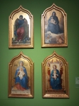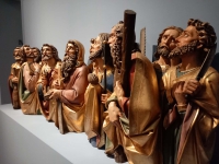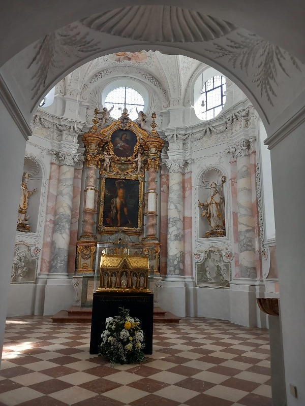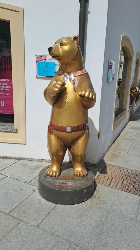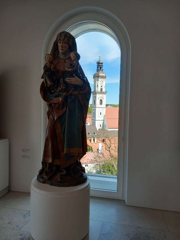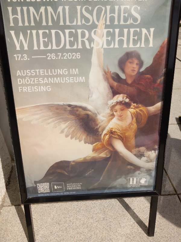 Anderer Tag, andere Uhrzeit, gleicher Treffpunkt. Heute Morgen schon um 9 Uhr trafen wir uns wieder vorm Rischart. Unser Ziel war dieses Mal die Domstadt Freising. Direkt am Bahnhof wurden vom Freisinger Bären begrüßt. Es gibt die Legende, daß der Bischof Korbinian einen Bären gezähmt hat, der seinen Packesel getötet hatte. Der Bär trug dann sein Gepäck weiter nach Rom und wurde so zum Wappentier von Freising. Wir benutzten den Schrägaufzug, der uns alle zum Diozesanmuseum hinaufbrachte. Hier besuchten wir die Ausstellung "Himmlisches Wiedersehen" von Ludwig I bis zum blauen Reiter. Zuerst fesselte uns eine Lichtinstallation, für die alle Überschuhe anziehen mussten. Hier fühlte man sich wie auf Watte, es war jedem schwindlig, ein komisches Gefühl. Die Einführung zur Ausstellung im 2. OG. führte uns durch den Glaspalast - dort wo heute wieder die Schrannenhalle steht - der später auch von einem Feuer total zerstört wurde. Die Architektur des Museums begeisterte uns und später konnten wir auch noch bei den Klängen eines Klavierkonzertes die Akkustik genießen.