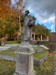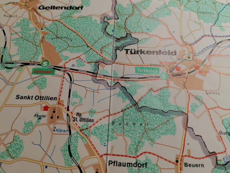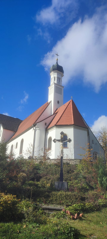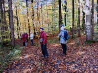 Heute morgen haben wir uns wieder um 10 Uhr 15 am Pasinger Bahnhof getroffen, um mit der nächsten S 4 nach Türkenfeld zu fahren. Sechs Wanderer waren auch trotz der nächtlichen Regenfälle und des kalten Windes da. Gemeinsam fuhren wir nach Türkenfeld, wo unsere Wandertruppe um vier weitere Wanderer erweitert wurde. Der Plan war von Türkenfeld aus durch den Wald nach St. Ottilien zu wandern. Dort zu essen und am Nachmittag die Klosterkirche und das Missionsmuseum zu besuchen. Danach vom S-Bahnhof Geltendorf wieder nach Pasing zurückzufahren. Vom S-Bahnhof Türkenfeld aus folgten wir einem Wegweiser Richtung St.Ottilien, der uns nach kurzer Zeit durch die Ortschaft zu einem Wald führte. Hier hatten wir die Wahl zwischen zwei Möglichkeiten, entweder entlang der Straße weitere 4,5 km oder durch den Wald. Wir entschlossen uns für die zweite Variante, durch den Wald, auch wegen der im Herbstlaub leuchtenden Bäume. Zum Teil waren die Wege glitschig und wir mußten Pfützen und herabgefallenen Ästen ausweichen. Aber wir hörten nach ca. einer Stunde schon das Mittagsläuten von der Klosterkirche in St.Ottilien und nach ein paar weiteren Schritten hatten wir auch schon eine Strasse erreicht, die direkt dorthin führte.