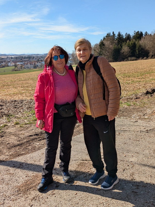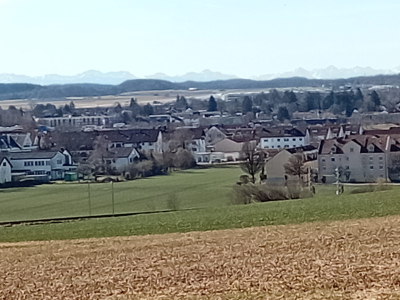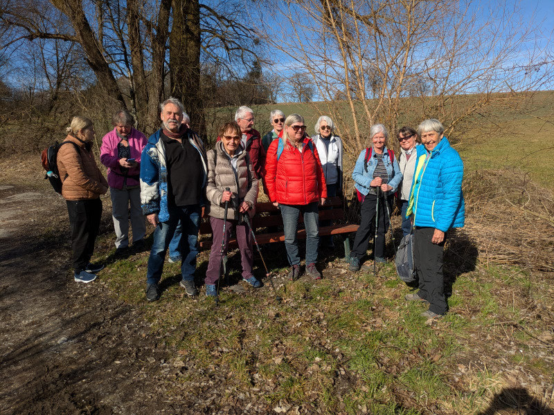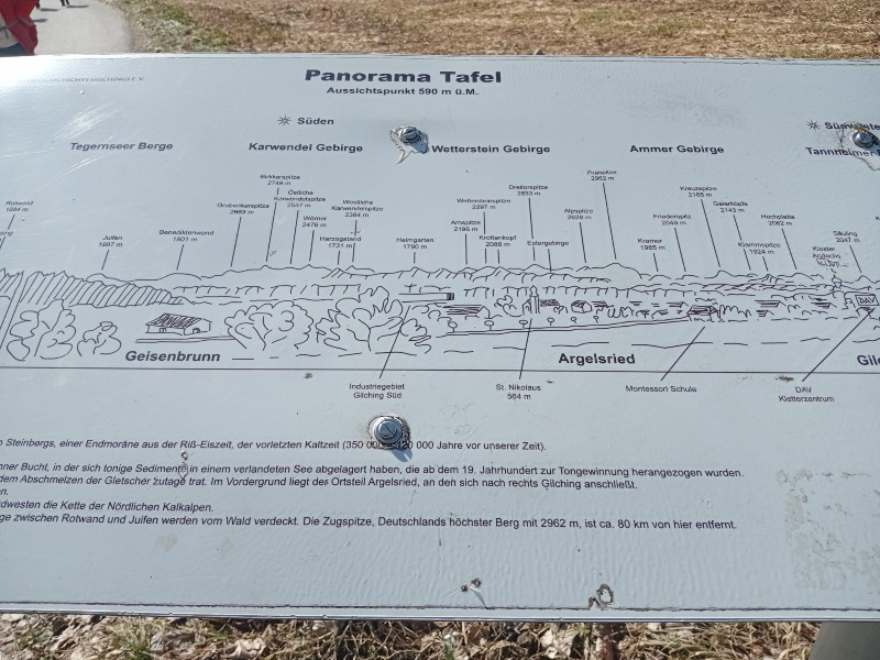 Heute war es wieder soweit. Wir trafen uns um 10 Uhr 15 in Pasing vorm Rischart um mit der nächsten S 8 nach Geisenbrunn weiterzufahren. Es war herrliches Wanderwetter, die Sonne lachte vom strahlend blauen Himmel. In Geisenbrunn wurde unsere Gruppe, kurz nach der Ankunft dort, durch drei weitere Mitwanderer ergänzt.  Wir wanderten weiter, jetzt 13 Personen stark, an den S-Bahn Gleisen entlang Richtung Gilching bis zu einer Brücke, wo wir wieder auf die Straße stießen. Dieser folgten wir nach rechts hangaufwärts bis zu einer Panoramaaussichtstafel und einer Bank, die wir zu einer kurzen Pause nutzten.
