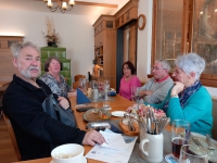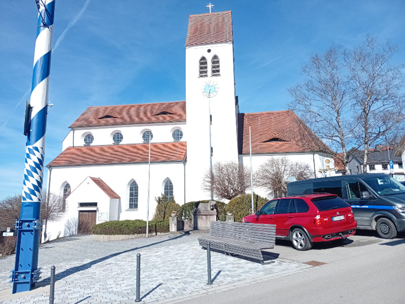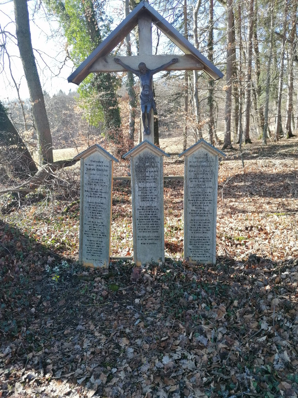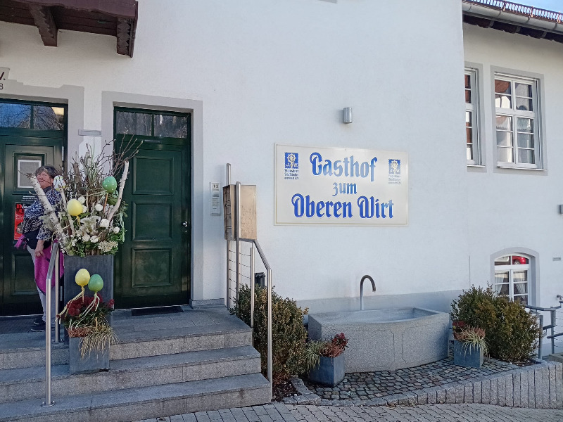 Der weitere Weg führte uns dann an drei Totenbrettern und einem Kreuz vorbei in den Wald hinein. Hier am Steinberg soll früher ein Alchimist gelebt haben. Auch gab es hier eine Sonderbaumschule, wie auf Tafeln, die am Weg stehen, erklärt wird und ein Waldkindergarten ist auch noch da. Nachdem wir den Steinberg überschritten hatten, ging es auf dem Waldweg wieder abwärts und wir passierten nach kurzer Zeit das Ortsschild der Gemeinde Gilching. Hier bogen wir dann wieder rechts ab auf den Leitenweg, wo auch ein markantes Gebäude mit zwei Erkern zu sehen ist. Die sogenannte Rosenburg, die ein Münchner Architekt hier erbauen ließ, aber nie darin wohnte, da er wegen der Kosten pleite ging und nach Amerika auswanderte. Der Name erinnert an einen Gärtner, der hier Rosen anbaute. Wir folgten jetzt der Gartenstrasse und nach ein paar weiteren Kurven war auch schon der Kirchturm von St. Vitus zu sehen. Dorthin gingen wir, denn neben der Kirche lag auch unser Ziel, die Gastwirtschaft zum Oberen Wirt, wo für uns hungrigen Wanderer ein Tisch vorbestellt war. Gestärkt durch Speis und Trank, es schmeckte mir sehr gut, wanderten wir danach den selben Weg wieder zurück. Es war eine sehr schöne und sonnige Vorfrühlingswanderung Ende Februar.