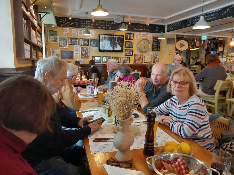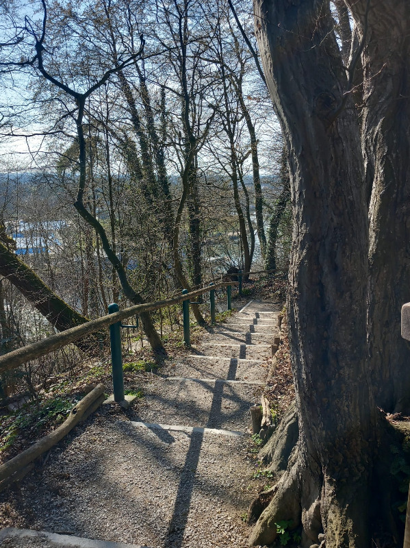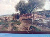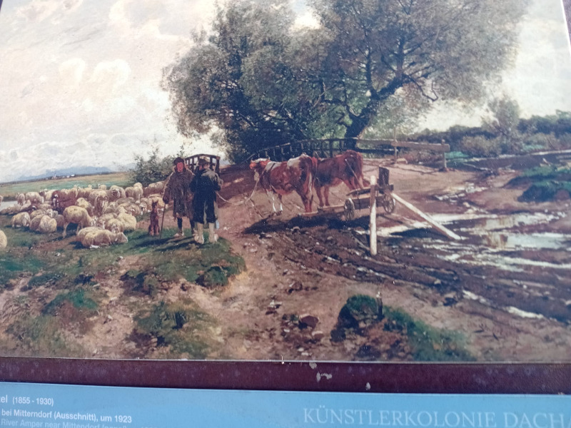 Nach einem kurzen Hinweis auf die Gemäldegalerie Dachau, die sich im Sparkassengebäude befindet und in der sehr schöne Gemälde ausgestellt werden, sind wir zum Dachauer Schloß, daß die Wittelsbacher als frühe Sommerresidenz vierflügelig errichten ließen und das nach Umbauten von Max Emanuel, heute nur noch einen Trakt hat, hinaufgegangen. Nach einem kurzen Spaziergang im sehr schönen Schloßgarten, von dem man auch einen wundervollen Ausblick hat, inzwischen hatte sich der Nebel etwas gelichtet, sind wir abgebogen Richtung Wasserturm und Altstadt. Dort war für uns nunmehr auch hungrige Wanderer in der griechischen Taverne Bakalikon, das frühere Gasthaus Unterbräu (lt. einer Hinweistafel, das älteste Gasthaus von Dachau) ein großer Tisch reserviert. Gestärkt durch Speis und Trank sind wir danach zu den weiteren Stationen des Dachauer Künstlerweges gegangen. Hierzu mußten wir wieder hinauf zum Schloß und durch den englischen Garten zu einer Stiege gehen, wo uns dann Bild Nummer 2 von Lovis Corinth (Waldstück bei Dachau) erwartete. Der weitere Künstlerweg führte nun in Serpentinen bergab zum Mühlkanal und dem Amperkraftwerk, wo wir nach wenigen weiteren Schritten, das Gemälde Nummer 3, das weiße Moos von Ludwig Dill, fanden. Nun folgten wir weiter der Amper flußaufwärts Richtung Mitterndorf entlang und kamen kurz nach Überqueren der Ludwig-Dill-Str. zu Bild Nummer 4, Pferde in der Schwemme von Max Feldbauer. Inzwischen hatte sich auch der Nebel aufgelöst und die Sonne strahlte von einem wolkenlosen blauen Himmel und es wurde, obwohl es erst März ist, ganz schön warm. Der weitere Weg führte uns bei der Amperbrücke zu Bild Nummer 5, Amperbrücke bei Mitterndorf von Otto Strützel, In der Ferne konnte ich auch die Sankt Nikolauskirche von Mitterndorf erkennen. Unser weiterer Weg führte uns jetzt auf die andere Seite der Amper, jetzt flussabwärts, zu Bild Nummer 6, Torfhütte von Bernhard Buttersack. Nur ein paar Schritte entfernt war dann auch schon Bild Nummer 7, Mädchen mit Reisigbündel von Arthur Langhammer. Dann führte der weitere Weg wieder auf die andere Amperseite, nur um nach Umgehung des Kraftwerks und des Familienbades nochmals die Seite zu wechseln. Dort ist dann auch Bild Nr.8, Abend an der Schleuse von Paul Thiem. Von hier ging es dann weiter zum Moorbad Park, wo uns Bild Nr.9, Amperbad von August Kallert, erwartete. Jetzt folgten wir dem weiteren Weg zum Mannheimer Platz, um dort das Bild Nr.10, Holzgartenstraße in Dachau von Robert Curry, zu betrachten. Auf dem weiteren Weg überquerten wir dann die Münchner Str. um zum Bild Nr.11, Blick auf Dachau vom Unteren Markt von Lilly Hildebrand-Uhlmann, zu kommen. Hier haben wir dann, weil wir in der Nähe des Bahnhofs waren und weil der Tag auch schon weit fortgeschritten war, auf gemeinsamen Wunsch unsere Kul-tour auf dem Dachauer Künstlerweg abgebrochen und sind nach einem gemeinsamen Eis essen mit der nächsten S-Bahn zurück nach Pasing gefahren. Es war ein sehr schöner gemeinsamer Ausflug in das geschichtsträchtige Dachau, bei dem wir auch Glück mit dem Wetter hatten.