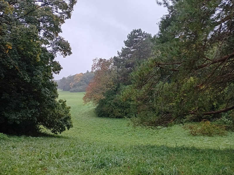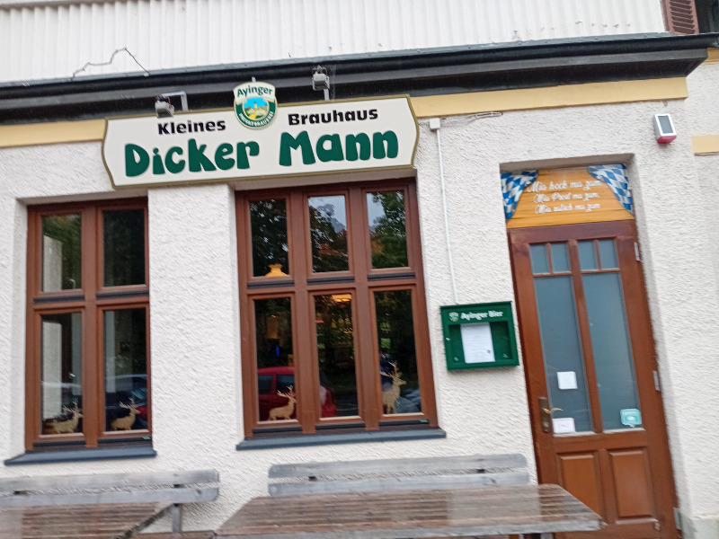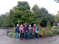 Wir entschlossen uns beim Betreten des Parks die große Runde, also die gelb gekennzeichnete, zu gehen. Wir genossen trotz des weiterhin herrschenden Nieselregens die schöne Landschaft. Die Ausblicke auf die teils alten Bäume, die grünen Wiesen und den See mit Brücke. Da es unter der Woche war und nieselte, begegneten wir nur vereinzelt anderen Spaziergängern. Viel zu schnell hatten wir den Park umrundet und waren beim Parkplatz des Michaelibads. Hier waren auch etliche Blumenrabatten angelegt. Nach nur wenigen weiteren Schritten waren wir auch schon bei der bayerischen Gaststätte " Dicker Mann " angelangt, wo auf uns hungrige Wanderer ein reservierter Tisch wartete. Das Essen war gut und die Bedienung war freundlich und so durch Speis und Trank gestärkt, sind wir danach wieder heimgefahren. Es war ein schöner Ausflug, auch wenn der Himmel grau war und es geregnet hat.