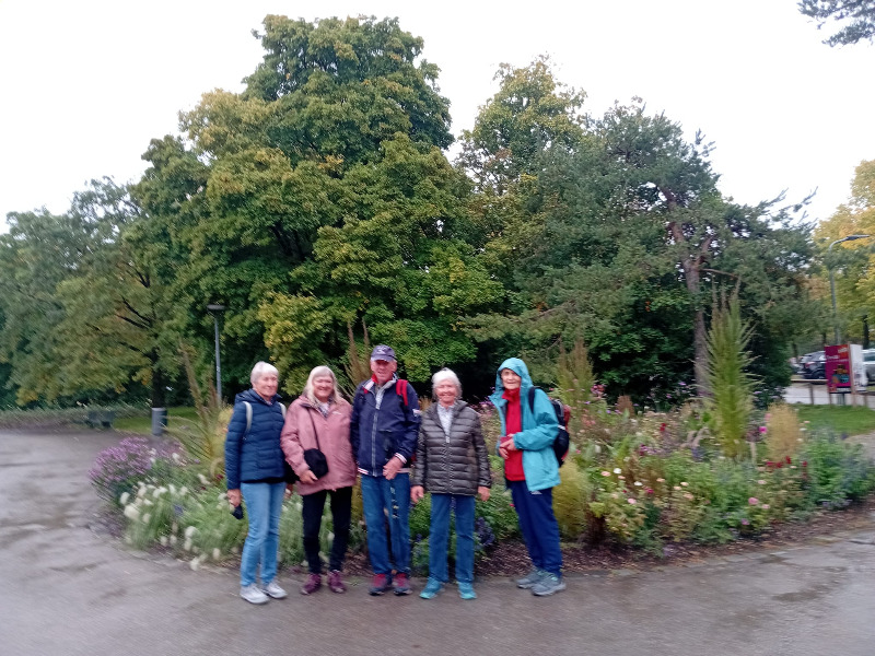 Wie an fast jedem zweiten Donnerstag im Monat trafen wir uns auch an diesem Morgen am S-Bahnhof Pasing. Diesmal war unser Ziel der Ostpark. Leider hatte es in der Nacht geregnet, es nieselte auch weiter und der Himmel war voller Wolken. Aber wir ließen uns vom Wetter nicht die Stimmung vermiesen und fuhren mit guter Laune in die Stadt. Nach mehrmaligem Umsteigen erreichten wir den U-Bahnhof Michaelibad, in dessen Nähe ein Zugang zum Ostpark liegt. Der 56 Hektar große Park im Münchner Südosten besteht seit 1973 und dient als Frischluftschneise für die Stadtteile Neuperlach und Ramersdorf. Für die Einwohner dieser beiden Viertel bietet er auch sehr viele Freizeitaktivitäten an. Den Park durchqueren verschiedene Wege, die alle unter einem bestimmten Motto stehen und farblich verschieden gekennzeichnet sind. An jeder größeren Wegkreuzung steht eine Tafel, auf der der genaue Standort und die verschiedenen Möglichkeiten der weiteren Wege aufgelistet sind.