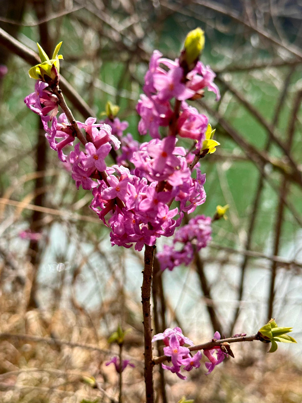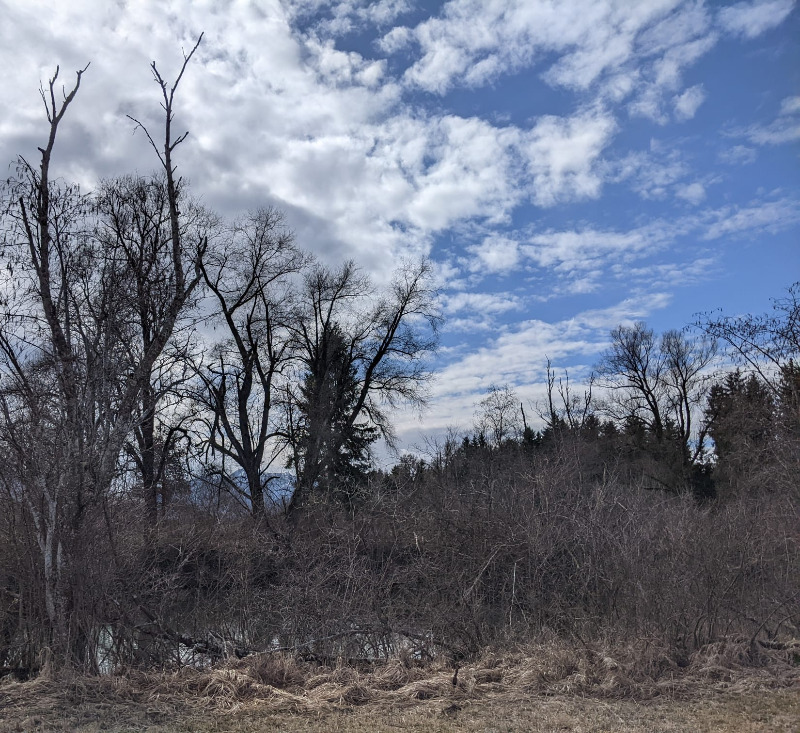 Auf der Höhe ging es weiter über Schönmühl runter zur Loisach. Dieser folgten wir für 3,5 km auf einem Pfad durch die Loisachfilze. In der noch kargen Moorlandschaft entdeckten wir erste Frühlingsboten: Seidelbast. Pestwurz und Veilchen. Wir konnten an vielen Stellen am Loisachufer über die Holzfällarbeiten der Biber staunen.